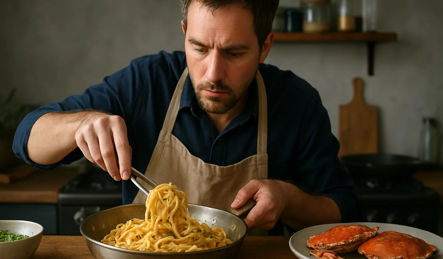 Cette fois, il mise sur des tagliatelles fraîches et du crabe, relevés par un zeste de citron et quelques herbes, le tout prêt en un clin d’œil.